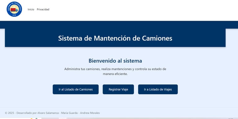 Este proyecto se esta desarrollando en equipo y consiste dos aplicaciones ASP.NET Core correspondientes a los sistemas de una empresa de transporte de carga: el Sistema de Mantención de Camiones y el Sistema de Transporte. Ambas aplicaciones utilizan una base de datos MySQL compartida y han sido desarrolladas con Visual Studio 2022 y Entity Framework Core 8 bajo la metodología Database First.