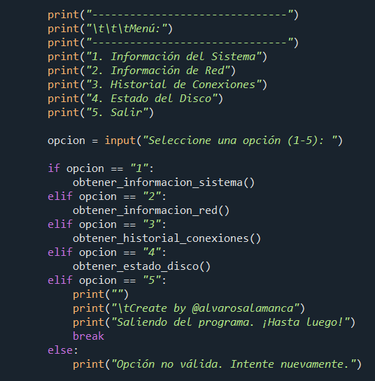 Esta herramienta de línea de comandos automatiza la obtención de información clave sobre el estado de tu equipo. A través de un menú interactivo, permite al usuario acceder rápidamente a distintos módulos que muestran: